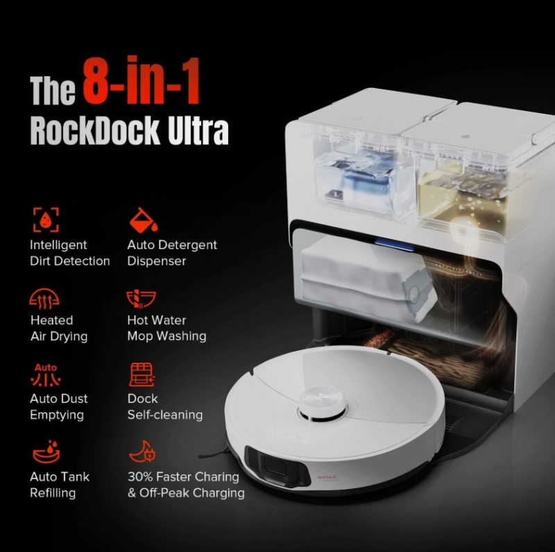 Flagmaninis robotas-siurblys su 10 000 Pa siurbimo galia, pilnai automatine RockDock Ultra stotimi. Siurbia, plauna, džiovina – be jūsų pagalbos. Idealus iki 250–300 m² namams. ⚠️ Pristatoma tik per kurjerį – siuntimas į paštomatus negalimas!