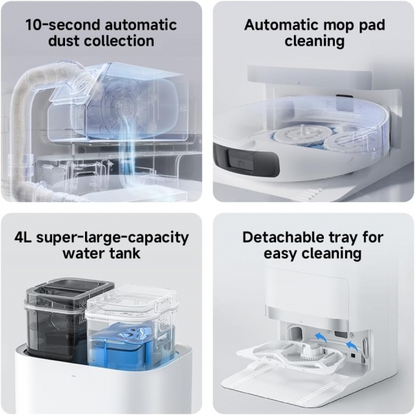 • Automatinė stotelė: pati ištuština dulkių talpą, nuplauna ir išdžiovina mopo šluostes — minimalus rankinis darbas.