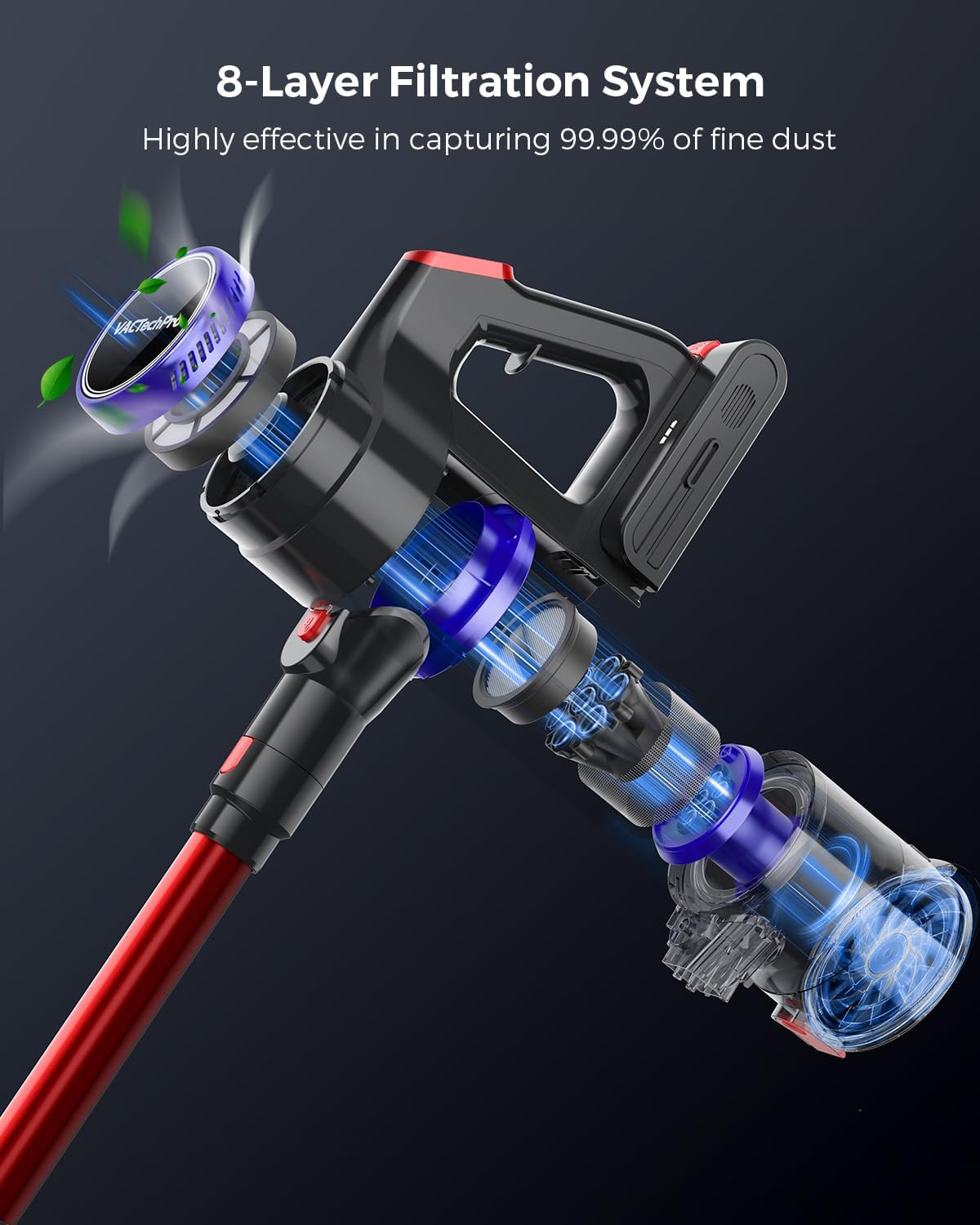 PUIKUS FILTRAVIMAS Belaidis dulkių siurblys aprūpintas „MultiVortex“ oro technologija, kuri efektyviai atskiria dulkes ir orą 7 kartus didesne išcentrine jėga, taip pat 8 sluoksnių filtro sistema, kuri surenka mikroskopines dulkes, kurių filtro efektyvumas siekia 99,99 %, ir lengvai pašalina dulkes, žiedadulkes ir alergenus. Novatoriška aktyvuotos anglies EPA konstrukcija leidžia pakartotinai filtruoti orą oro išleidimo angoje, sukuriant sveiką ir gaivią gyvenamąją aplinką. Interaktyvus LED išmanusis ekranas: belaidis dulkių siurblys aprūpintas LED jutikliniu ekranu su išmaniuoju HD ekranu, kurį galima valdyti viena ranka. Taigi galite lengvai reguliuoti siurbimo galią, stebėti akumuliatoriaus būseną ir tiksliai sekti valymo eigą. Turėdami 9 išmaniąsias stebėjimo funkcijas, įskaitant įkrovimo klaidų įspėjimą, temperatūros stebėjimą, dulkių priminimą ir užsikimšimo priminimą, galite stebėti įrenginio būseną, rasti problemas ir mėgautis efektyvia bei išmania valymo patirtimi.