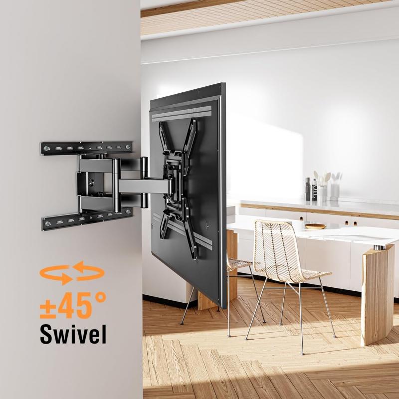 Optimalus žiūrėjimo kampas – reguliuojamas laikiklis gali suktis į šonus +/- 45°, kad padengtų daugiau žiūrėjimo pozicijų, palenkti +5°/-10°, kad sumažintų atspindžius, ir pasukti ekraną +/- 3° po montavimo. Taip pat išsitempia iki 35,5 cm (14"). Patogu nustatyti geriausią žiūrėjimo kampą.
