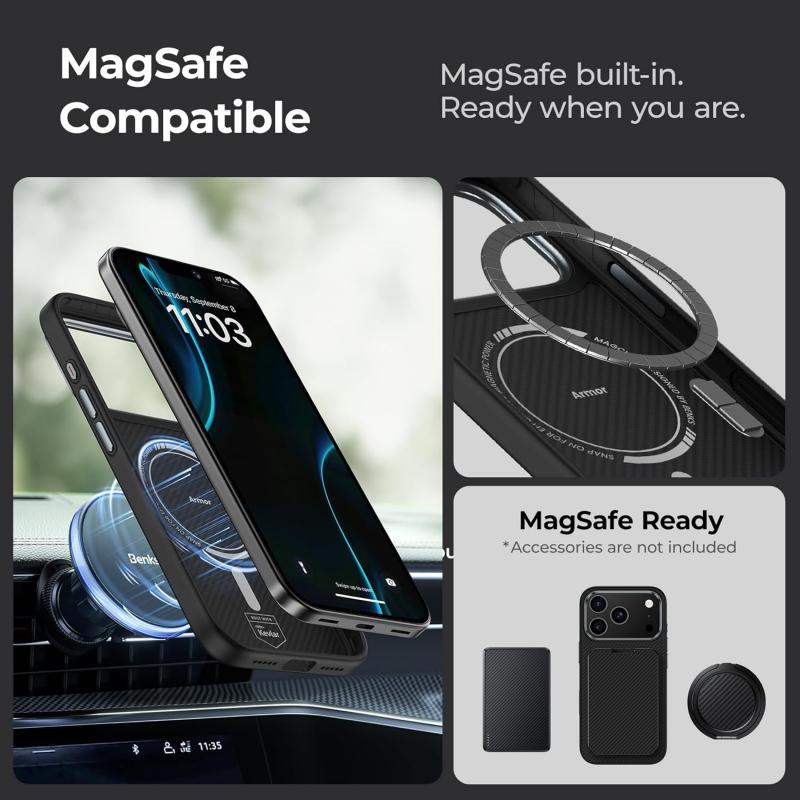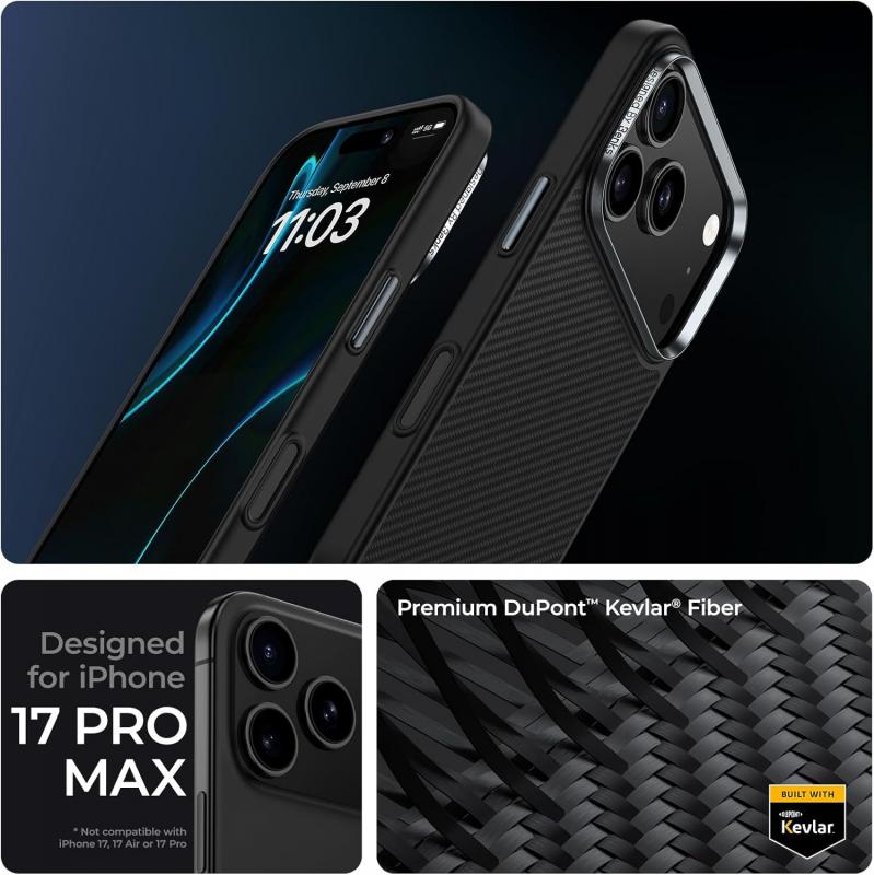 Pagamintas iš patvaraus 600D Kevlaro pluošto ir TPU apsauginio rėmelio, kartu su novatorišku smūgius sugeriančiu dizainu, šis dėklas suteikia išskirtinę apsaugą „iPhone 17 Pro Max“. Unikalus aliuminio kameros rėmelis ir 360° smūgiams atsparios oro pagalvės efektyviai sugeria smūgius, todėl jūsų įrenginys išlieka saugus net po kritimo.
