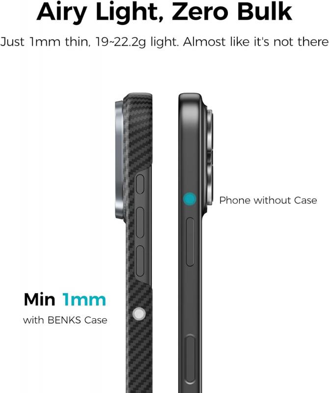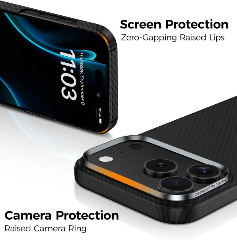 Vos 1 mm storio ir sveriantis tik 22,5 g, dėklas išlaiko originalų „iPhone 17 Pro“ ploną dizainą. Kruopščiai suprojektuotas su didelio atidarymo metaliniu objektyvo rėmeliu, jis visiškai neužstoja kameros, todėl fotografuoti galima be rūpesčių. „BENKS ArmorAir“ išsiskiria itin plonu ir lengvu dizainu, kartu suteikdamas kasdienę būtiną apsaugą.
