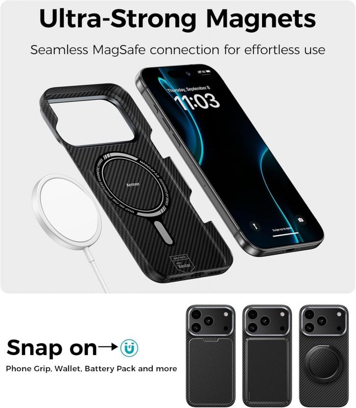 „BENKS ArmorAir Slim-Fit“ dėklas turi galingus magnetus, specialiai sukurtus „iPhone 17 Pro“. Įmontuoti 37 N56 magnetai užtikrina visišką „MagSafe“ suderinamumą – dėklas puikiai veikia su visais „MagSafe“ priedais, tokiais kaip žiediniai laikikliai ar piniginės. Jei ieškote plono ir praktiško apsauginio dėklo savo „iPhone 17 Pro“, šis modelis – puikus pasirinkimas.