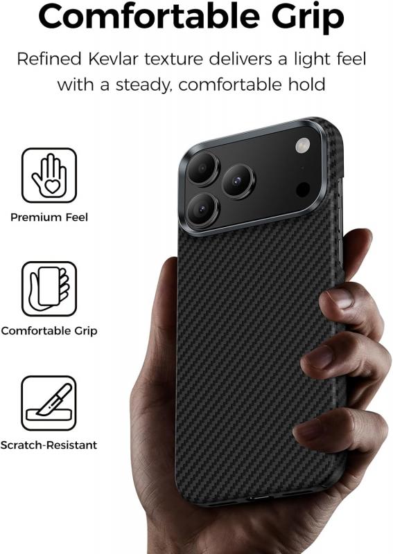 „iPhone 17 Pro“ dėklas, pagamintas iš originalaus „DuPont Kevlar 600D“ pluošto – tvirto, bet lengvo medžiagos, plačiai naudojamos aviacijoje ir karinės paskirties įrangoje. Jis pasižymi išskirtiniu tvirtumu, lengvumu, atsparumu įbrėžimams, korozijai ir spalvos pakitimams, apsaugodamas jūsų „iPhone 17 Pro“ nuo pažeidimų nepridėdamas nereikalingo storio.