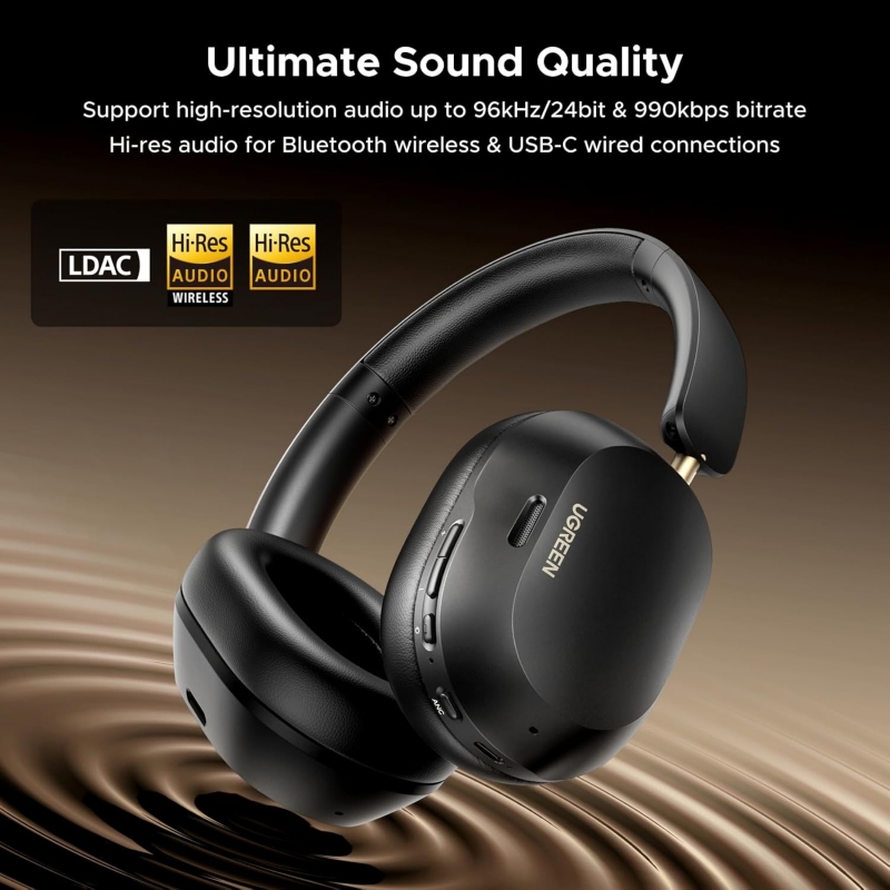 Hi-Res garsas: „UGREEN Max5c“ Bluetooth ausinės palaiko Hi-Res garsą tiek naudojant Bluetooth, tiek laidu. Integruotas 40 mm dinaminis PED kompozitinis garsiakalbis suteikia sodresnį, detalesnį ir kokybiškesnį garso atkūrimą. Palaikomi AAC, SBC ir LDAC dekodavimo formatai. „Max5c“ taip pat palaiko iki 96 kHz / 24 bitų garsą, kurio maksimalus bitų srautas siekia 990 kbps.